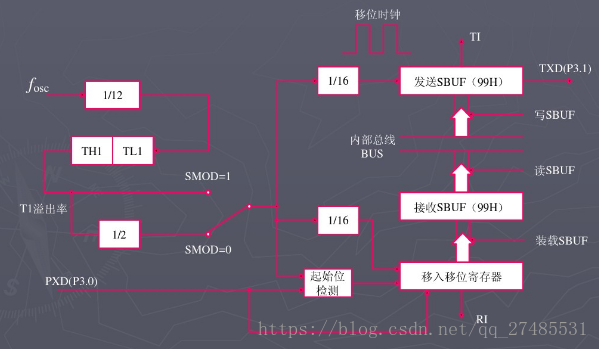 串行发送与接收的速率与移位时钟同步。89c51用定时器1作为串行通信的波特率发生器。T1溢出率经2分频(或不分频)后又经16分频作为串行发送或接收的移位脉冲。移位脉冲的速率即波特率。