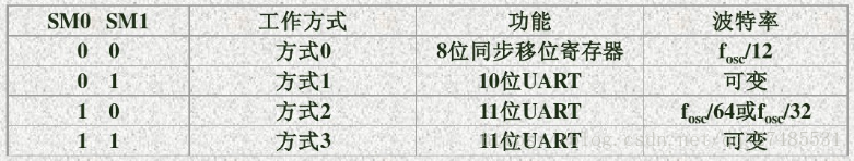 ①SM0和SM1 :串行口工作方式选择位 ,两个选择位对应四种通信方式,如下图所示,其中fosc是振荡频率