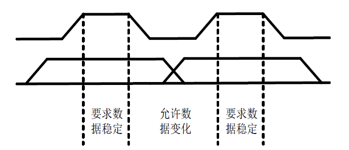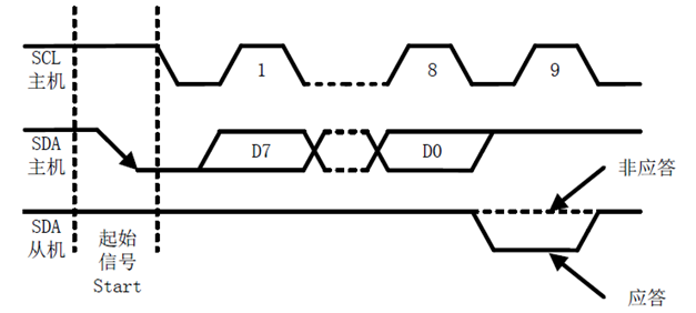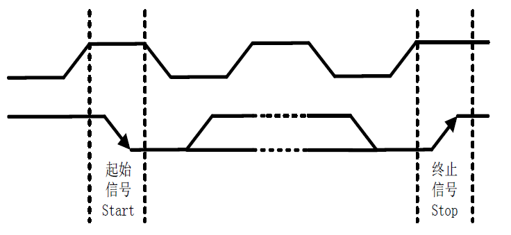 - 起始信号:在时钟(SCL)为高电平的时候,数据总线(SDA)由高到低的跳变;