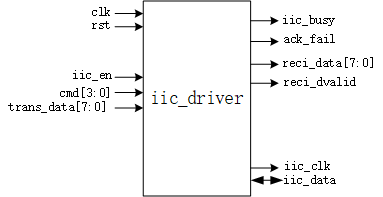 IIC协议虽然只有两根线,协议规定也简明清晰,但是要使用HDL实现,并不是一件“愉快”的事情,因为思路很难理清楚,可能会导致代码臃肿,资源浪费的情况出现。如下图所示为iic_driver模块,IIC协议规定每8bit数据为一个传输单位,需要有一个ACK信号,基于此,将所有的IIC消息分为带起始位写8bit,不带起始位写8bit,带停止位写8bit,不带起始位和停止位读8bit,带停止位的读五种操作类型,默认都带有应答位。因此创建IIC驱动模块的主要思路就是,保持读或写8bit的主体结构,区分五种命令以区分是否带起始位、是否带停止位、是否有ACK、是读还是写。当针对不同的设备器件写入不同的器件地址,或者是不同器件有不同的操作要求时,可在此驱动之上写一个模块用来满足器件要求,称此模块为iic_ctrl模块。例如,某型eeprom的一条写入数据命令依次为,带起始信号写入器件地址和写请求,不带起始位写入EEPROM内部地址,带停止位写入要写入的8bit数据,完成写入操作,iic_ctrl的任务就是将此写入命令拆分成了3个8bit主体,然后“调用”驱动模块完成写入操作。本节仅介绍驱动模块的编写,如下图所示。clk和rst分别为该模块的时钟和脉冲信号;iic_en为输入脉冲信号,拉高一次代表执行一次“8bit操作”,cmd表征了具体执行哪一个“8bit”操作,cmd[0] 1为读操作,0为写操作。cmd[1] 1为带起始位,0为不带起始位。cmd[2] 1为带停止位,0为不带停止位。cmd[3] 1为ACK,0为NOACK(在带停止位的读或者写操作中可以不要ACK信号)。Trans_data为要传入的8bit数据,不同的操作可能包含了器件地址、读写指示等。矩形框右侧为输出信号,iic_busy代表驱动模块正在忙,无法相应当前请求。Ack_fail标识是否有相应失败的情况,reci分别是读取到的数据和该数据的同步信号。