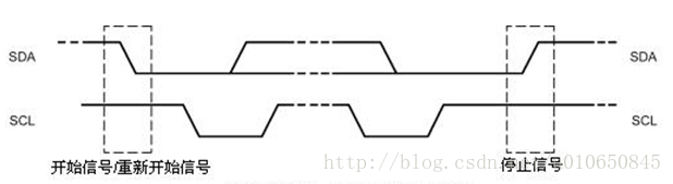 4. 重新开始信号:在IIC总线上,由主机发送一个开始信号启动一次通信后,在首次发送停止信号之前,主机通过发送重新开始信号,可以转换与当前从机的通信模式,或是切换到与另一个从机通信。当SCL为高电平时,SDA由高电平向低电平跳变,产生重新开始信号,它的本质就是一个开始信号。