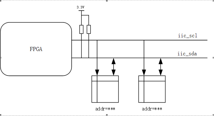 传输速率标准模式下可以达到100kb/s,快速模式下可以达到 400kb/s,高速模式下可达 3.4Mbit/s,具体使用要看设备的支持情况。IIC接口只需要两条总线线路,即 SCL(串行时钟线)、SDA(串行数据线),IIC 总线是半双工通信。本篇解决的问题就是使用FPGA驱动这两根线实现标准IIC协议,但要清楚使用IIC接口于某设备通信要同样遵守设备的要求,例如IIC接口的EEPROM,会要求现发送读写地址,发送读写指示等。
