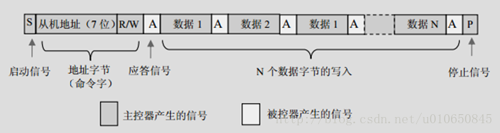 - 主机传输器件地址字节,其中最低位为 0,表明为写操作;