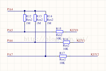 PA4,是充电引脚。PA5、PA6、PA7是电平的检测引脚。这里用的是三个按键,R12、R13、R14是充电的限流电阻,这三个电阻要在几百K到几M欧之间,视单片机的性能而定吧,电阻越小电流越大充放电时间就越短,有句话说就是可以避免夜长梦多。但是电阻太小了,时间太短单片机就检测不到了。我在这选的是1M欧,充放电时间大概是10us,R15,R16,R17作用不是太大,不能取太大就是了。