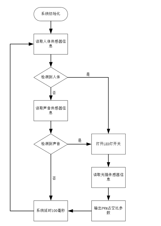 3、系统包括三个主要流程。感应器感应到人体点亮灯,感应器感应到光强改变灯的亮度,感应器感应到一定音量点亮灯。在控制系统中,各传感器设备和控制单元最终以指定方式与主控制器相连,实现各单元之间的通讯和控制;
