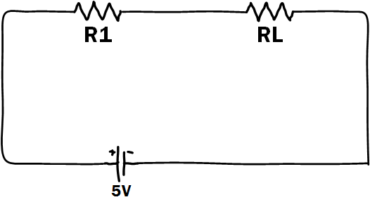 上图中,RL是光敏电阻,R1是串联的分压电阻, Vout=RLR1+RL∗Vin ,在黑暗中,RL的阻值会很大很大,所以Vout也就很大,接近5V。一旦有光线照射的话,RL的值就会迅速减小,所以Vout也就随之减小。通过上面这个公式可以看出, R1选取不能太小,最好在1k~10k左右,否则比值变化不明显。