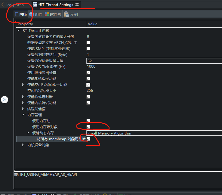 我们使用的是480*272分辨率且接口定义为RGB565。所以单幅画面所需的内存大小为480*272*2=261120byte=255kb。255kb远大于STM32F429IG可使用的RAM大小,所以我们需要使用上篇文章中使能的SDRAM来进行内存的申请,具体配置如下。打开RT-Thread Setting