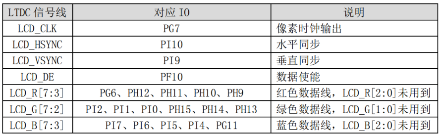 根据正点原子开发板手册可知,屏幕控制相关的LTDC接口定义如下