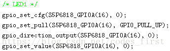 (4)gpio_set_value 函数用于GPIO_A16 设置为低电平。对其它的LED 灯执行同样的操作,我们便完成了LED 灯的初始化。