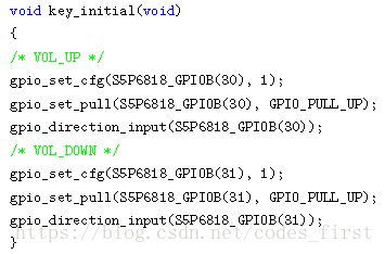 首先还是用gpio_set_cfg 函数,将VOL+ 和VOL-端口设为GPIO 模式,gpio_set_pull 将其上拉,gpio_direction_input 将端口方向设定为输入。