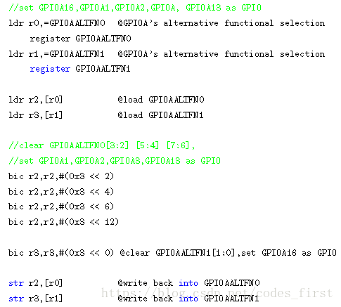 为了实现目标,我们需要将GPIOA端口设为GPIO功能。首先,读入功能选择寄存器GPIOAALTFN0和GPIOAALTFN1,将GPIOAALTFN0的低8位设为0;再将第13 位设为0;最后将GPIOAALTFN1的最后一位设为0。