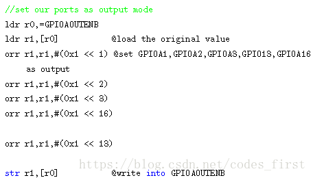 之后,在输出使能端GPIOAOUTENB将我们需要使用的端口(1,2,3,13,16)设为1,即使能。