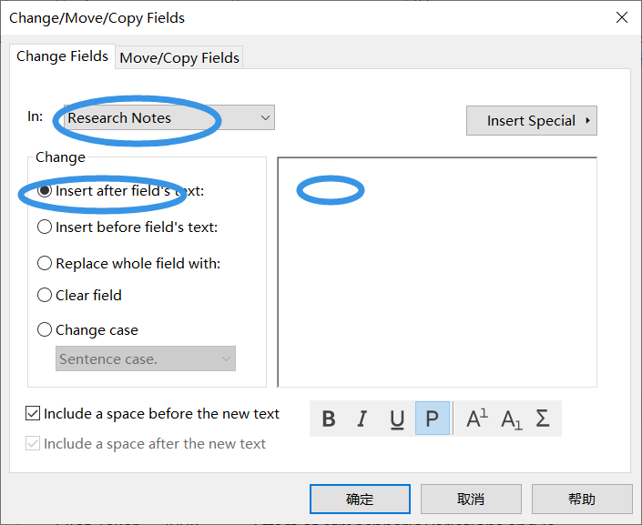 必须要注意一点:批量修改域时,务必选择‘Insert after fields text:’,这表示在已有的内容后面添加空格,而不是把已有内容更换成空格。否则以前写的Reseach Ntoes都可能搞丢了。