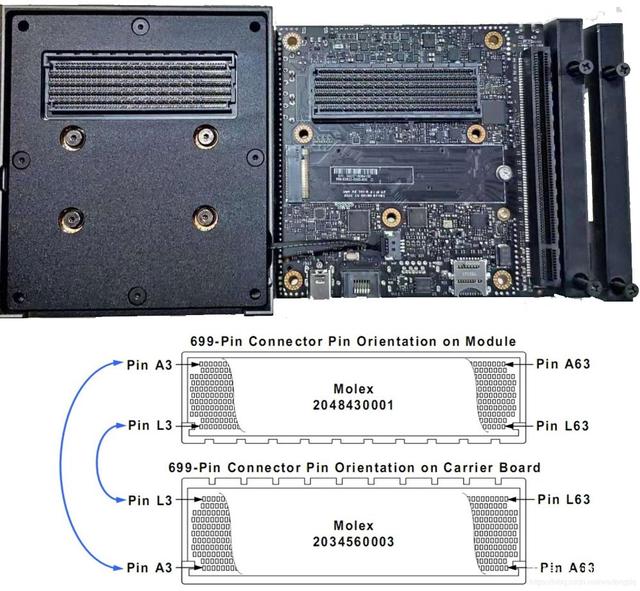 Xavier通过一个699-Pin连接器与载板连接。载板上699-Pin连接器的型号为 Molex的 2034560003, 对应的核心板上的是 Molex 的 2048430001
