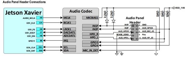 Jetson载板包括一个10-pin(2x5, 2.54mm)音频面板接头连接器(J511)。 这可以用来连接到标准的PC音频面板,支持连接到麦克风,耳机,功率扬声器等。