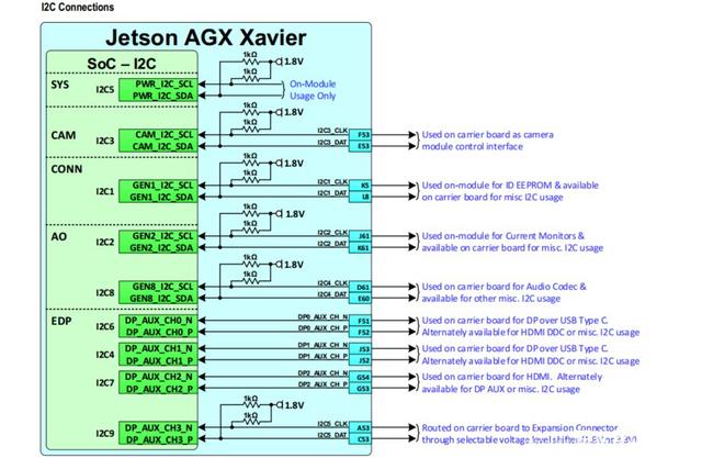 Xavier 有9组I2C, 有1组内部模块电源用了, 实际引出8路I2C。支持7-bit或者8-bit两种格式,支持100/400/1000等频率。
