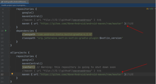 第一步,在根目录的build.gradle文件下进行依赖我们上传的仓库路径,以raw/master结尾: