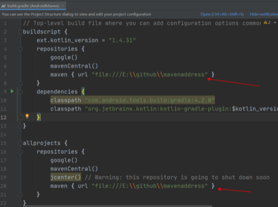 第一步,在根目录的build.gradle文件下进行依赖我们本地的路径,也就是上边我们生成aar文件的地方。