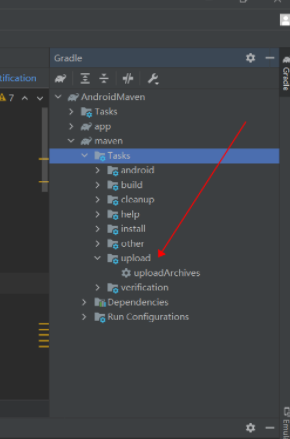 以上三步完成之后,点击Android studio右侧的Gradle,找到对应的Library下的Tasks下的upload,双击uploadArchives 就会在第二步中自己定义的路径下打出自己的aar。