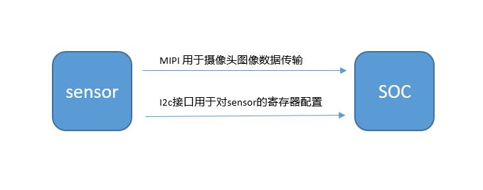 一般情况下,Camera和SOC有两个接口进行连接,分为为MIPI接口和I2C接口,其中MIPI接口用来传输图像的数据,数据传输路径为从Sensor传输到SOC。另一个接口为I2C接口,主要是用来SOC对Sensor初始化配置寄存器和摄像头参数的配置,比如要进行图像数据捕获的时候就需要通过i2c对Sensor的寄存器进行配置。