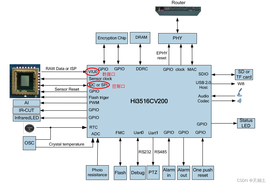 (2)在《Hi3518EV20X/Hi3516CV200经济型HD IP Camera Soc用户指南》文档第15页中有如下框图。其中sensor输出的数据在输入SoC时,一般使用并口/MIPI/LVDS接口,而sensor与SoC之间的控制接口一般使用I2C、SPI。