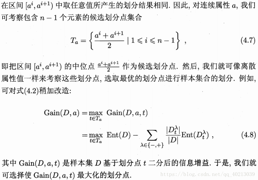对于具有连续值的属性来说,我们应该取该属性的取值区间作为分类的判断条件,取值区间的选取也遵从纯度提升最大的原则,具体操作如下: