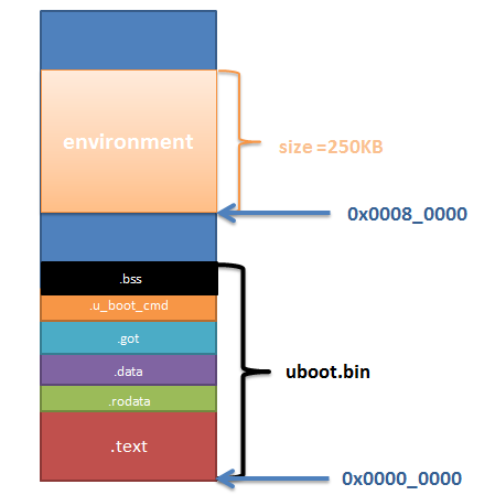 uboot.bin烧入到flash的0地址位置,boot.bin里面的数据就是按我们连接脚本中的数据那样分布。在0x80000(512KB)开始的位置就是环境变量的在flash的位置,其大小为256KB。