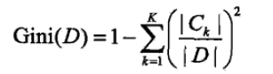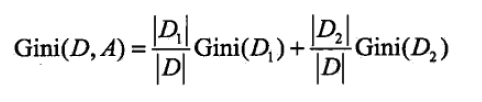 对于特征A,如果根据特征A的某个值a,把D分成D1和D2两部分(一般是大于和小于),则在特征A的条件下,D的基尼指数表达式为: