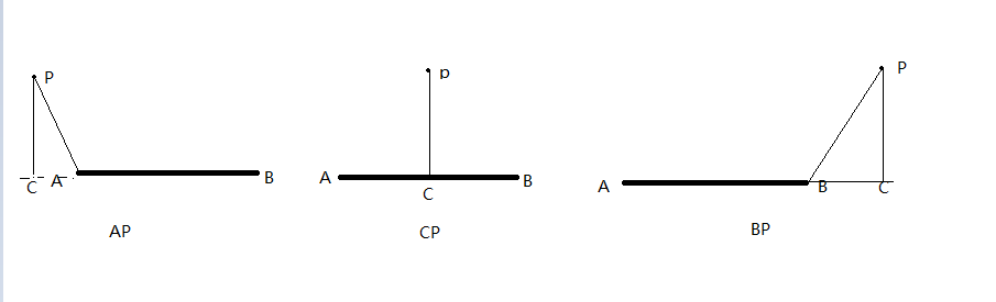 最短距离分别是AP,CP,BP.第一种情况和第三种情况基本相似。首先我们要判断点在线段端点的两侧(1,3)还是在两个端点之间(2)。假设p垂直于直线AB的交点为C,我们只需要计算出AC(粗体代表向量)的方向以及大小即可。如果AC和AB反向,则是图1.如果AC和AB同向且AC的长度小于AC的长度,则是图2.若AC和AB同向且AC大于AB的长度,则是图3.