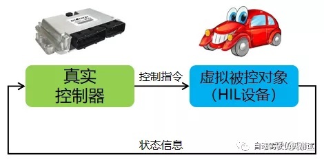 进行HIL测试时,使用HIL设备替代真实被控对象,接收所有控制指令,并模拟所有状态信息返回给真实控制器,使控制器以为自己在控制真实对象,从而形成测试闭环。