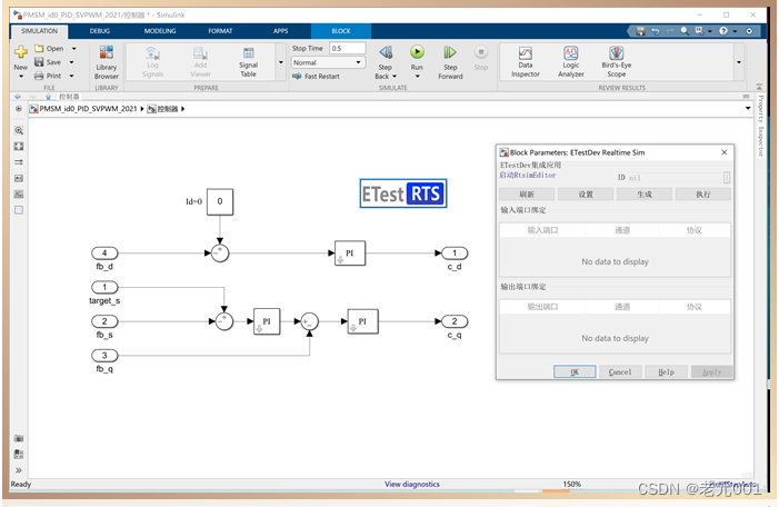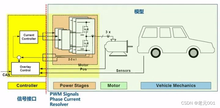 在信号级系统中,控制器为真实控制器,其余如逆变器、电机以及负载均以模型的形式运行在实时仿真机中。外围接口部分主要为PWM控制信号、各类保护逻辑、电流采样接口(弱信号)、Resolver及CAN等。