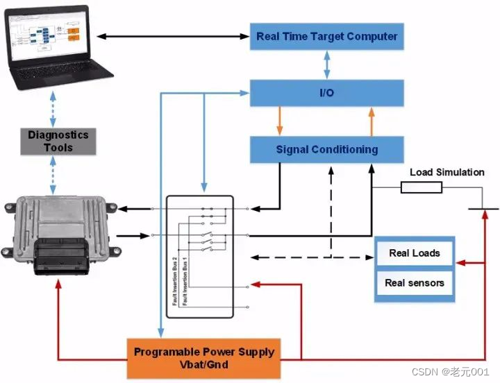◆Load Simulation:负载仿真。当ECU工作时,部分通道需要输出电流控制某些继电器、阀体等。如果将这些通道直接连接到实时系统IO上,由于实时系统IO的阻抗很高,不能产生足够的电流。因此需要在通道上连接一些负载,以ECU可以正常工作,不会被诊断存在问题。