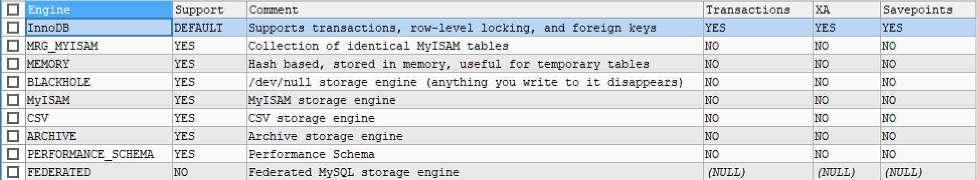 | Engine | Support | Comment | Transactions | XA | Savepoints |