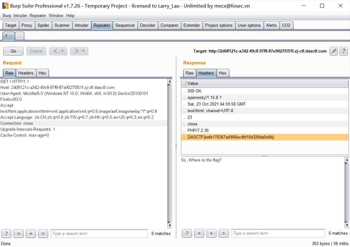 纯签到题,题目给了一个网址,直接burpsuite抓包,在响应头上拿到flag