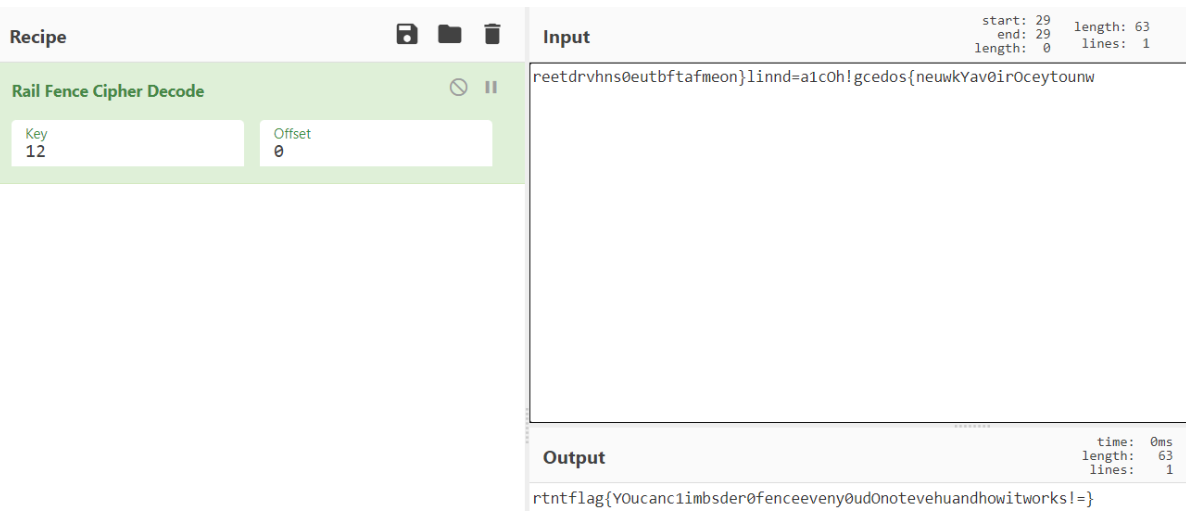 题目名提示栅栏,直接尝试栅栏编码解密,在12栏发现flag字样