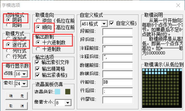 这次只是显示几个字嘛,所以就不用转换图片成.coe文件了,直接用字模提取软件PCtoLCD2002提取字模,下面是直接的配置。