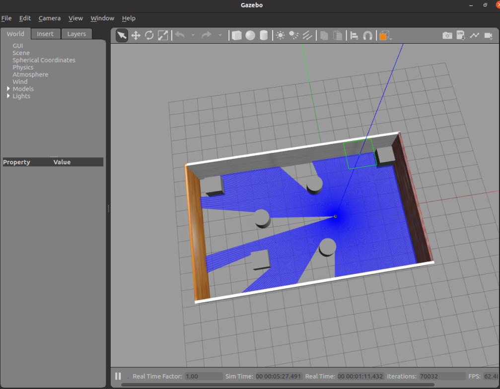 启动 Gazebo,使用 Rviz 显示雷达信息。