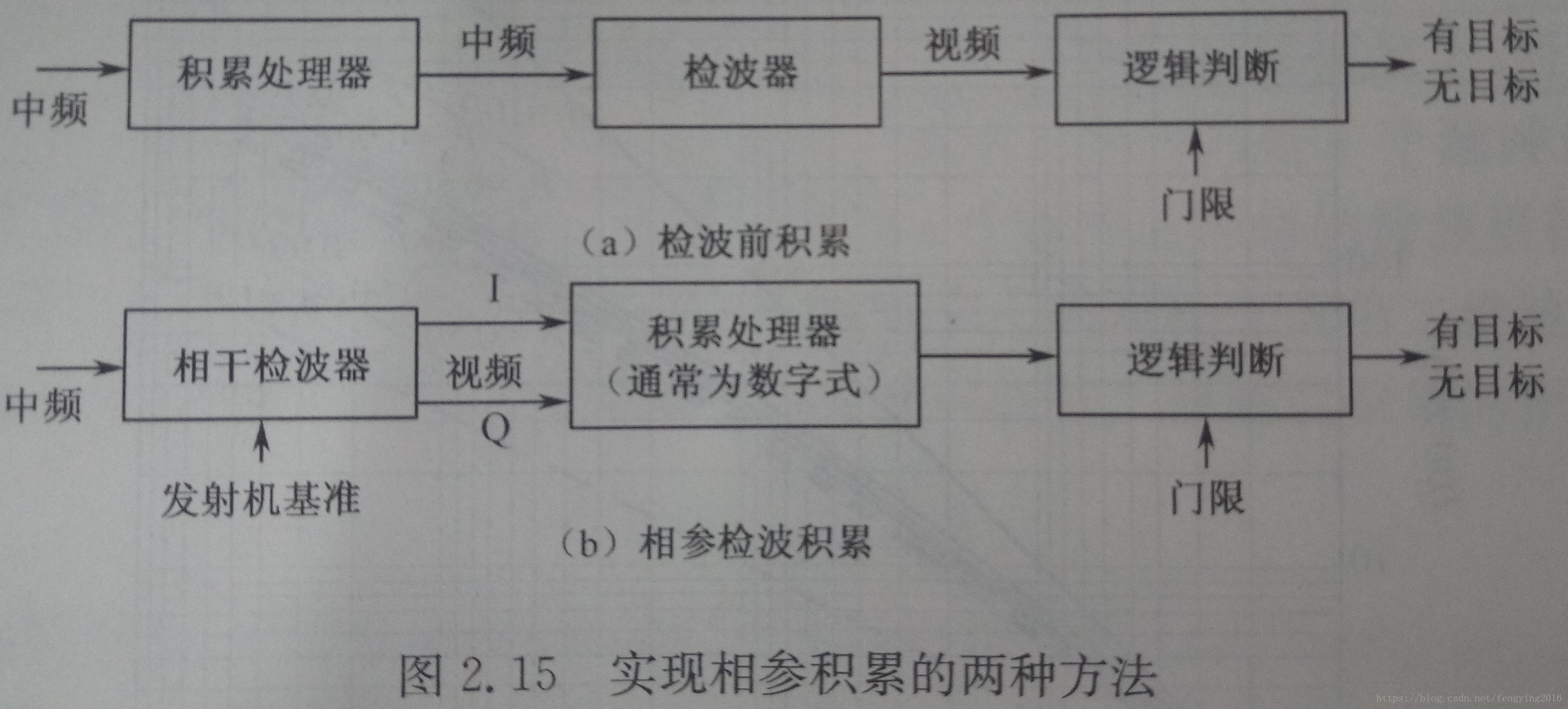 第一种实现,如果对中频信号进行积累,就必须接收信号是相参的才能实现相参积累。第二种情况,检波器是相参检波器,积累是在相参检波器之后用两个正交信号来实现的。