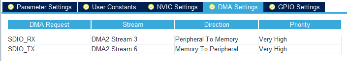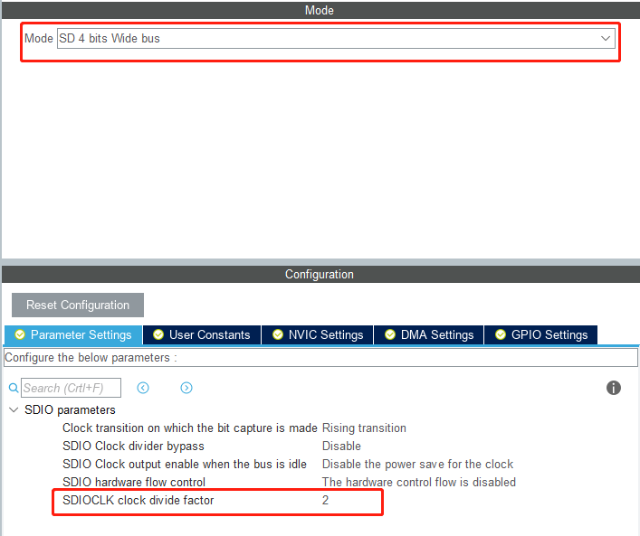 2. sdio选择为4线模式,分频系数为2,并配置中断和dma。注意中断优先级sd > dma > usb