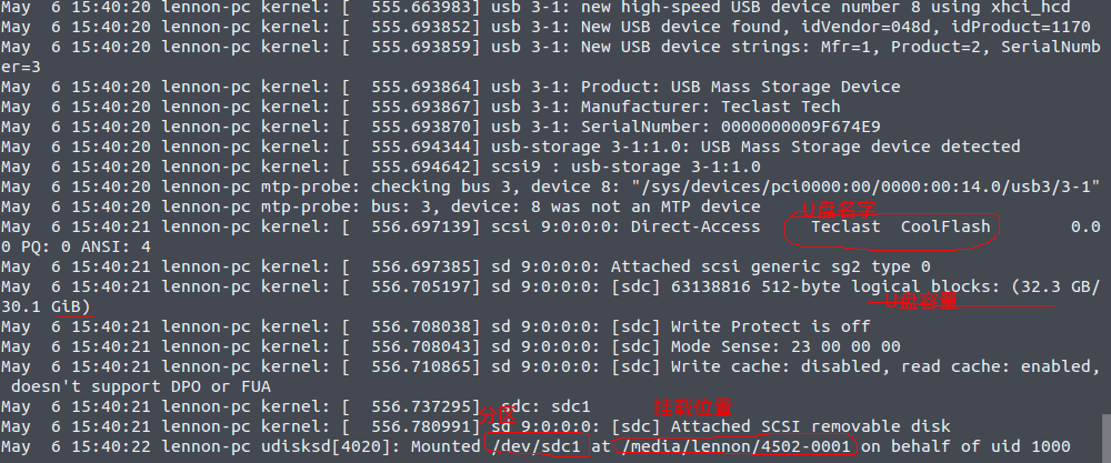 可以看到我的U盘名字是:Teclast CoolFlash U盘容量是:32GB 分区是:/dev/sdc1 挂载位置是:/media/lennon/4502-0001