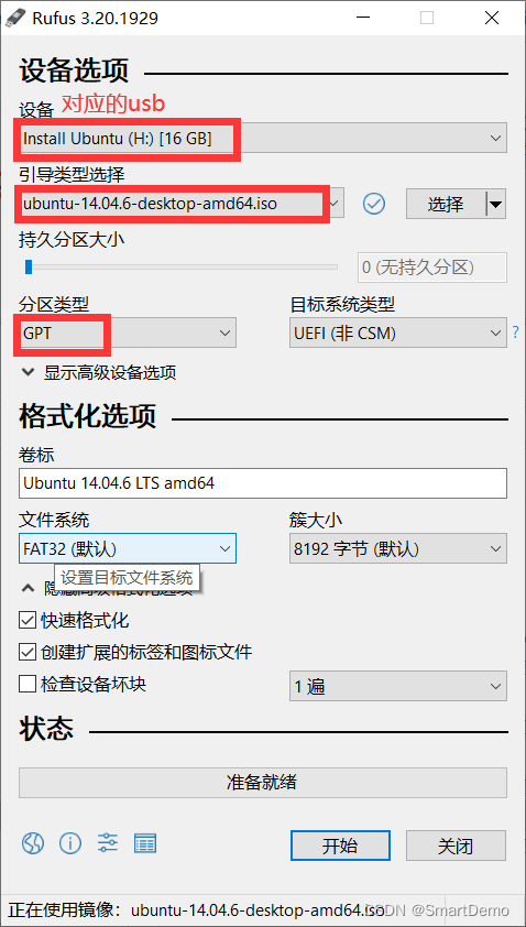3、双击rufus-3.20.exe,具体配置如下(红色为需要修改的)