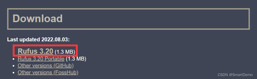 1、下载rufus,下滑至Download,选择Rufus 3.20
