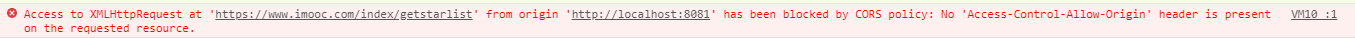 当我们在本地请求慕课网上的地址时,控制台报错,提示跨域。(之所以请求慕课网的url,是因为慕课网支持jsonp,我们暂且理解为慕课网后台已经配合进行了改动)。