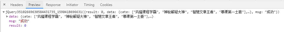 由此可以得出jsonp的实现原理为:当前端请求设置dataType="jsonp"时,浏览器会自动在url中添加callback="jqueryxxx"请求参数。对应服务器在接收到callback参数时,知道了这是一个jsonp请求,就会自动把返回的json对象转化为"jqueryxxx(json对象)"脚本的形式返回。