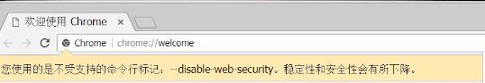 既然跨域是浏览器的一种安全限制,那是否可以让浏览器不做跨域限制呢?答案是肯定的,我们设置浏览器禁止检查--disabled-web-security --user-data-dir,重新打开浏览器,会发现在浏览器顶部提示: