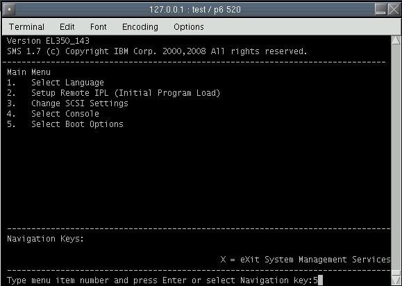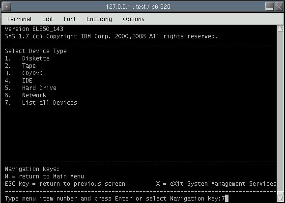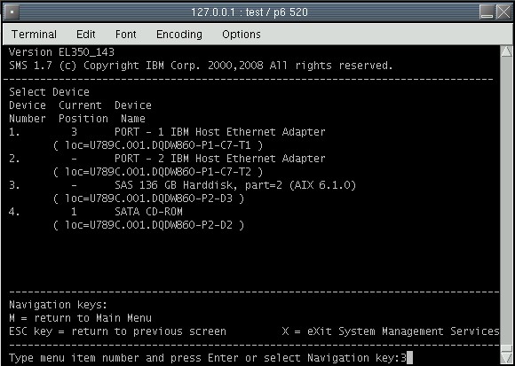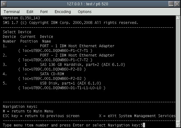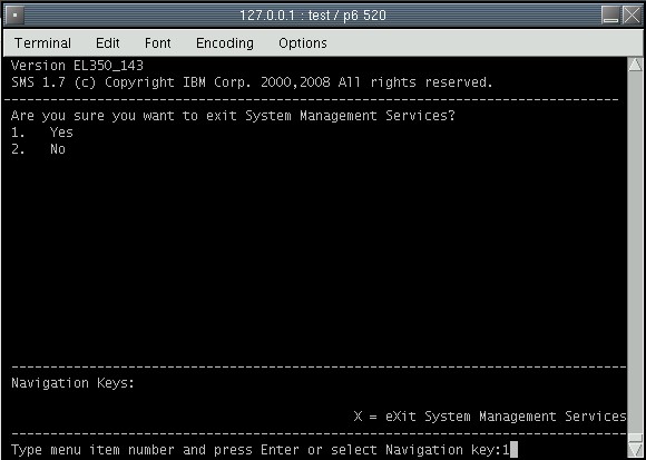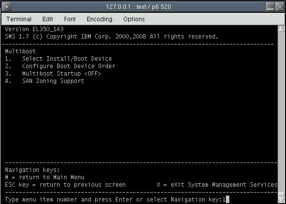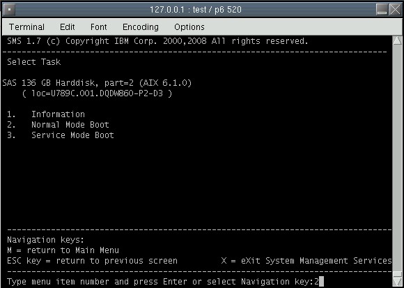 将hdisk1插入新服务器,新插入的盘不会自动引导系统的启动,需要在分区启动时进入SMS菜单,手动指定磁盘启动。
