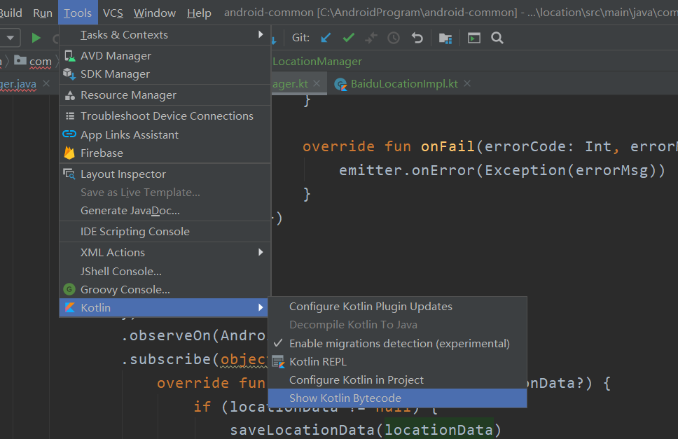 先来个题外话,我们如何看 kotlin 对应的 java 代码,kotlin 最终还是要编译成 java class 在 JVM 上运行的,有时我们的确是想看看用 kotlin 写完的代码编译完了是什么样子,这样有助于我们理解 kotlin 语法
