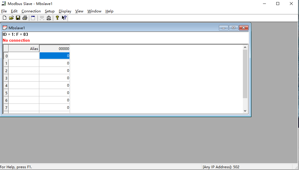 其中:Tx = 4表示向主站发送数据帧次数,图中为4次; Error = 0表示通讯错误次数,图中为0次; ID = 1表示模拟的Modbus子设备的设备地址,图中地址为1;F = 03表示所使用的Modbus功能码,图中为03功能码; SR = 1000ms表示扫描周期。红字部分,表示当前的错误状态,“No Connection”表示未连接状态。