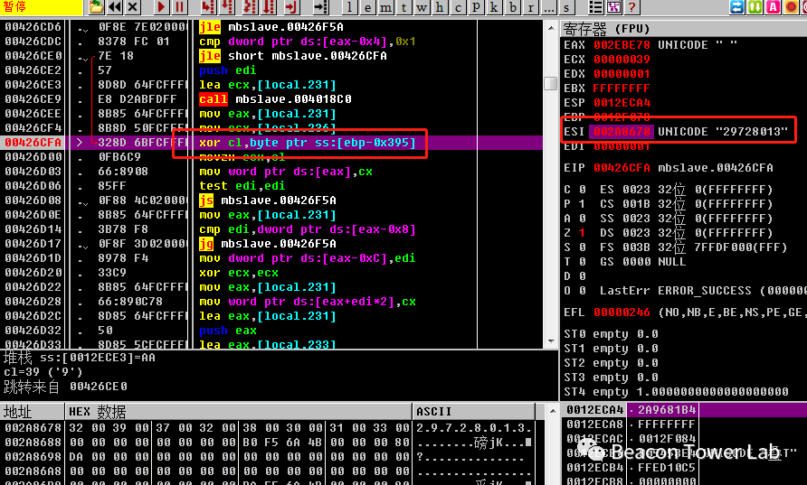 在IDA中查找数据来源,结合OD中动态调试分析,发现覆盖的数据是地址0x00426CFA处的代码运算后的结果,这是一条异或运算的汇编代码,按字节异或,如下图所示: