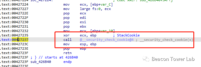 常见的栈溢出利用可以利用被覆盖的函数返回地址执行任意shellcode,即漏洞发生后,覆盖了栈中函数返回地址,当当前函数执行完毕后,将跳转到函数返回地址执行代码,但是该程序中开启了Security Cookie栈保护安全机制,位于0x00427237地址处,在函数返回前,Cookie检验失败,无法利用该方法。